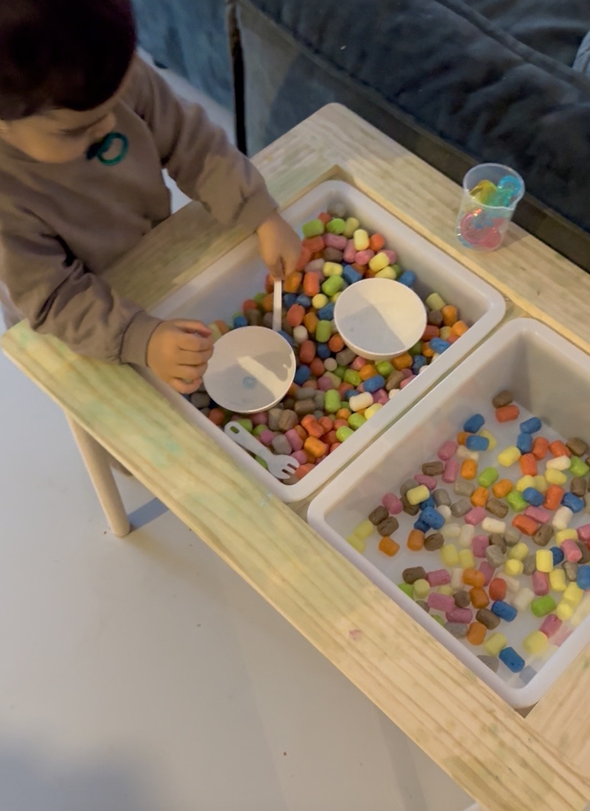 Je hebt het vast al eens voorbij zien komen: de houten tafel met plastic bakken van Ikea (waar je ongeveer 80 euro voor kwijt bent). Ik vond het idee leuk omdat je jouw kindje op een veilige manier in aanraking kan laten komen met verschillende materialen alleen had ik er geen 80 euro voor over. Ik vond dezelfde speeltafel bij Aldi voor 50 euro. Online kan je een soortgelijke tafel vinden voor 53 euro.