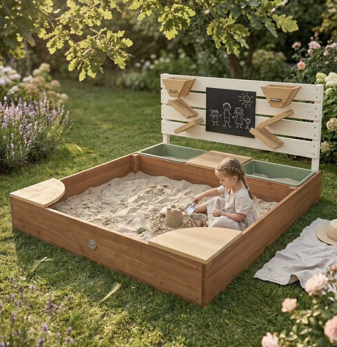 Deze zandbak is niet alleen een plaatje om te zien. Hij heeft ook leuke extra's zoals een waterwand, een krijtbord en plastic bakken. En heel toevallig is hij nu met korting!